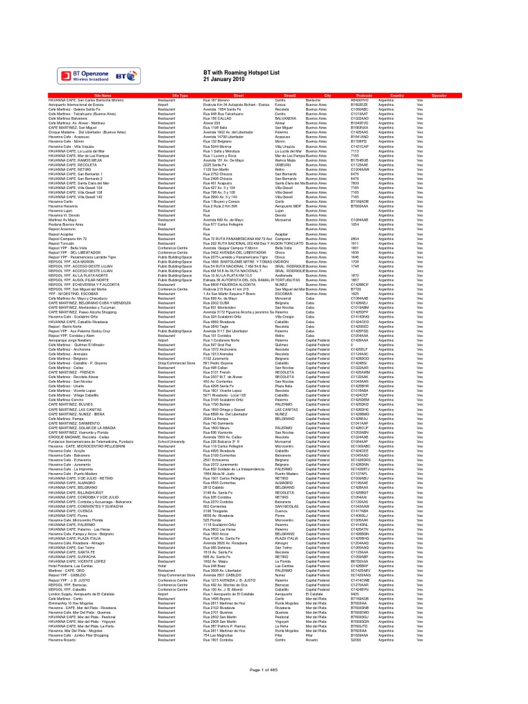 Bt With Roaming Hotspot List 29 October 2012 Hotspot Directory